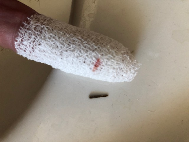 Vor einem Monat erwischte ich bei Holzarbeiten einen Holzsplitter in den kleinen Finger der linker Hand. Obwohl ich dachte, ihn wieder herausgezogen zu haben, ist offensichtlich ein Teil drinnen geblieben, das sich nach zwei bis drei Tagen, als die Wunde schon zugewachsen war, erkennbar machte, indem die Fingerkuppe dicker & heisser wurde!