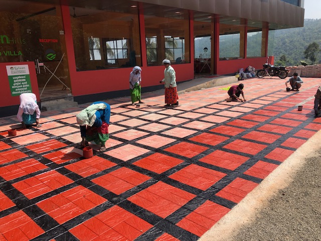 Auch hier ist die Rezession gut sichtbar: Von den elf kleineren und grösseren Resorts, die hier in den letzten 20 Jahren gebaut worden sind, die (ausser einem, siehe unten) nicht mal fertig sind, ist die Hälfte gar nie eröffnet und die andere Hälfte bereits wieder geschlossen worden. Der vor sechs Jahren gekachelte Vorplatz des offenen Resorts wird gerade von Hand neu gestrichen (!?)… Mit zehn Personen, auf typisch indische Art! Und weil auch hier die Küche nicht fertig ist, kocht Nischa zu Hause für 22 Personen das Dinner, und Rafique liefert es und rechnet grad in Cash mit dem Manager ab.